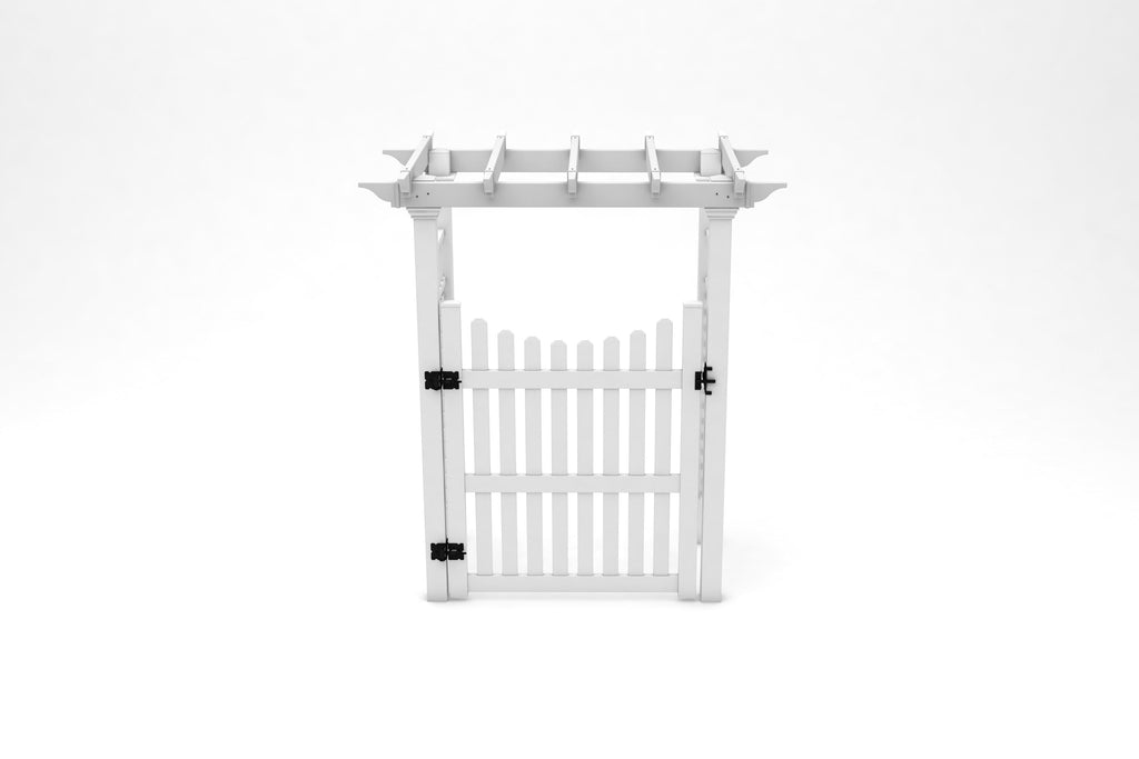 The arbors that are compatible with the Cottage picket gate are: Fairfield, Fairfield deluxe, Nantucket Deluxe, Westchester, Newport.